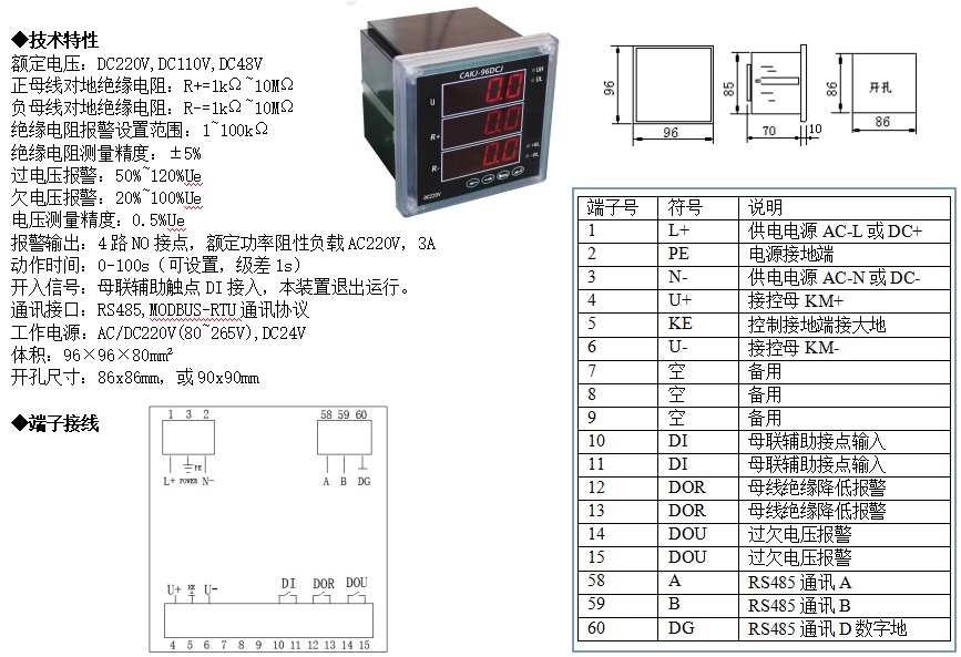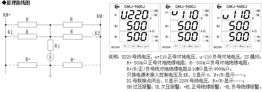 CAKJ-96DCJ絕緣監(jiān)察裝置,適用于DC300V以下直流不接地系統絕緣監(jiān)測。通過橋式比較電路及乒乓輔助判斷電路,準確計算出直流母線正負極對地絕緣電阻(單母線絕緣降低或雙母線平衡絕緣降低),并給出不同信號,為直流系統故障分析提供依據。