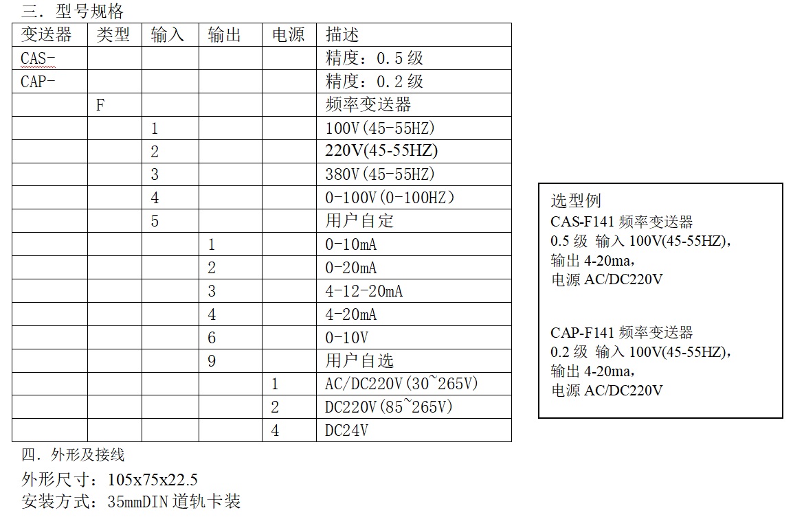 CAS系列頻率變送器是將被測電壓頻率信號轉(zhuǎn)換成按線性比例輸出直流電流、電壓并隔離的設(shè)備,配以相應(yīng)的指示儀表或裝置是電力系統(tǒng)、遠(yuǎn)動裝置、自動化控制系統(tǒng)等可選的模擬量采集模塊。